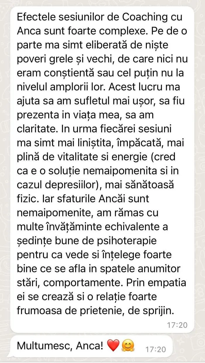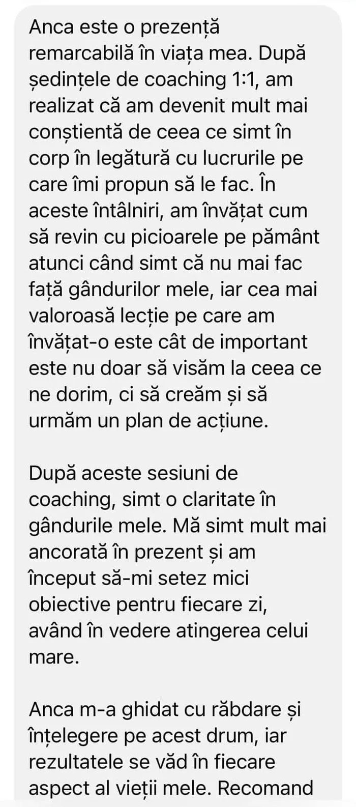 În cele 1 - 3 sesiuni de coaching alături de mine, vei trece printr-un proces foarte rapid de transformare, iar rezultatele te vor uimi şi te vor încânta.
